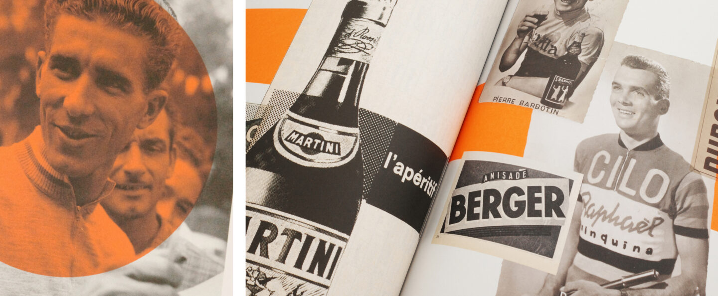 Dès les premières pages, le ton est donné. Le livre adopte une forme volontairement fragmentée, proche du carnet personnel. Collages, photographies anciennes, coupures de presse, affiches d’époque, détails graphiques de maillots, anecdotes manuscrites : on feuillette davantage un journal intime qu’un ouvrage académique. Ce qui frappe immédiatement, c’est l’authenticité. Il ne s’agit pas d’une reconstitution artificielle de la culture cycliste. Bien au contraire, on sent que chaque image, chaque objet reproduit, provient d’une collection personnelle patiemment constituée.
